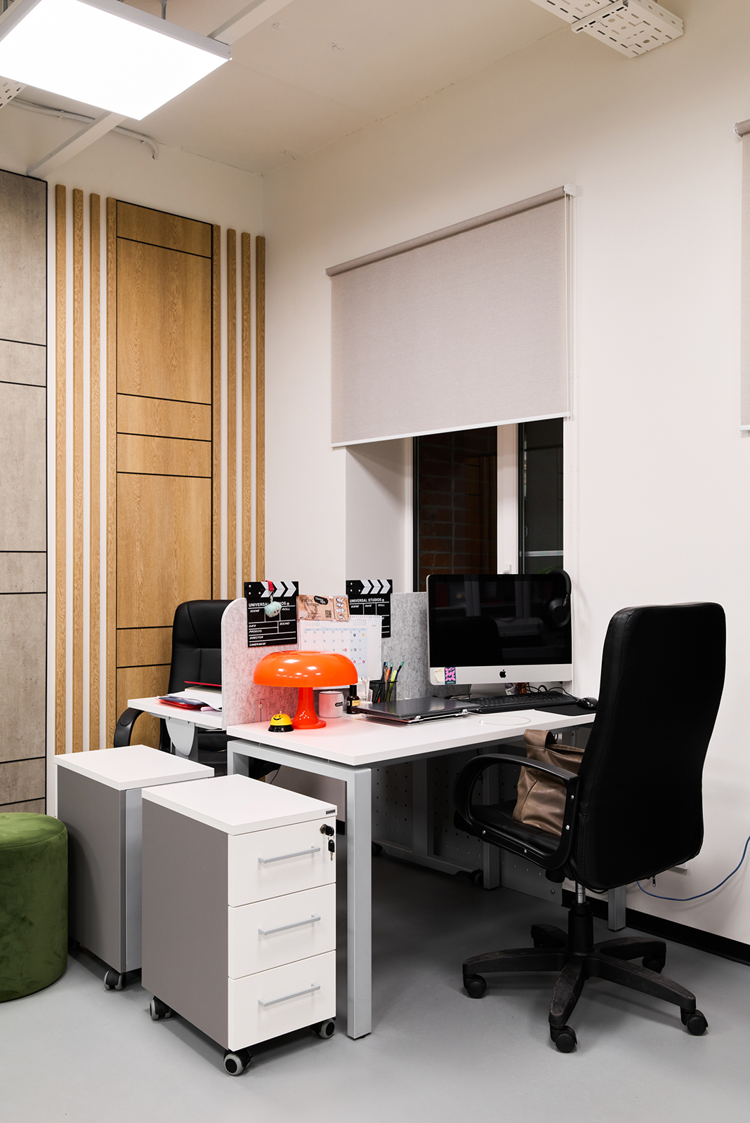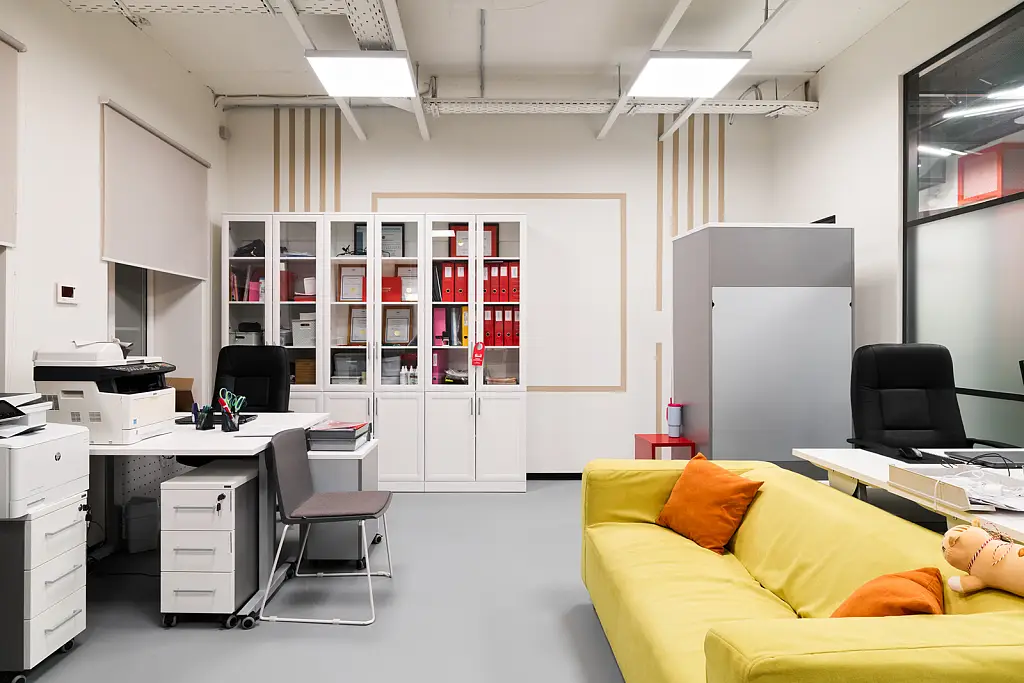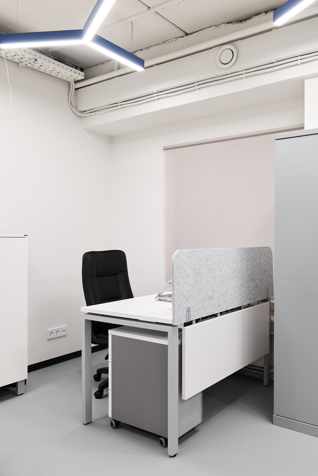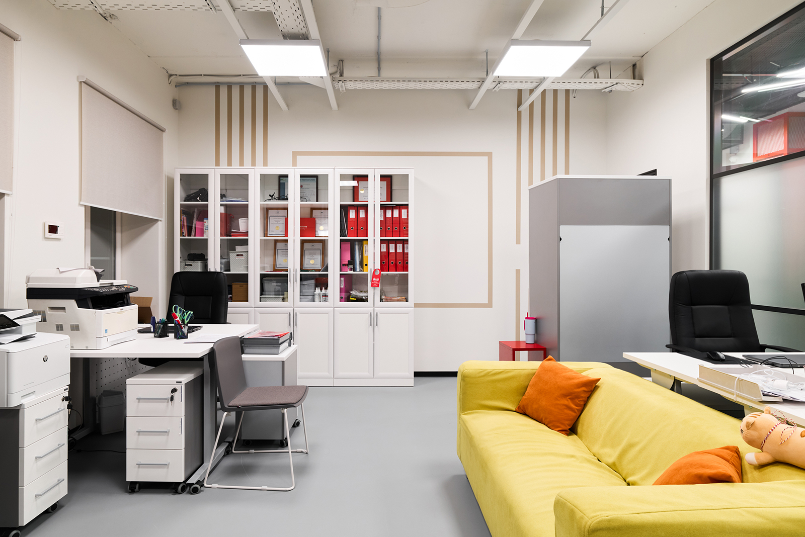 Кабинеты сотрудников выполнены в соответствии с дизайн-проектом помещения с точным расчетом расстояния между рабочими местами и расстановки мебели — тем самым мы обеспечили продуманную организацию и повышенный комфорт.