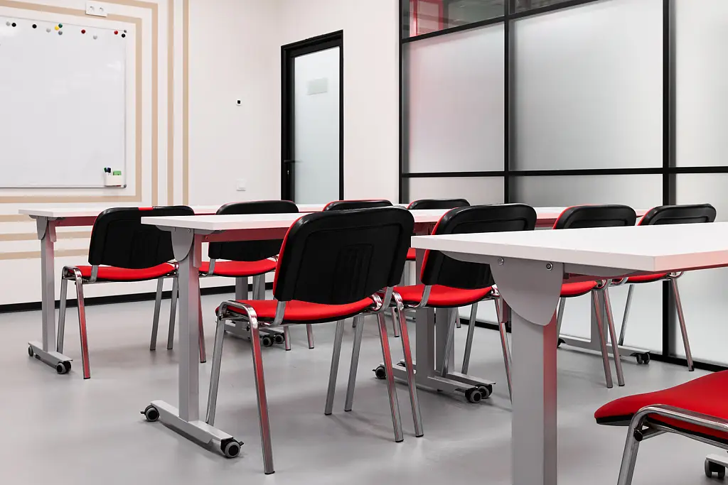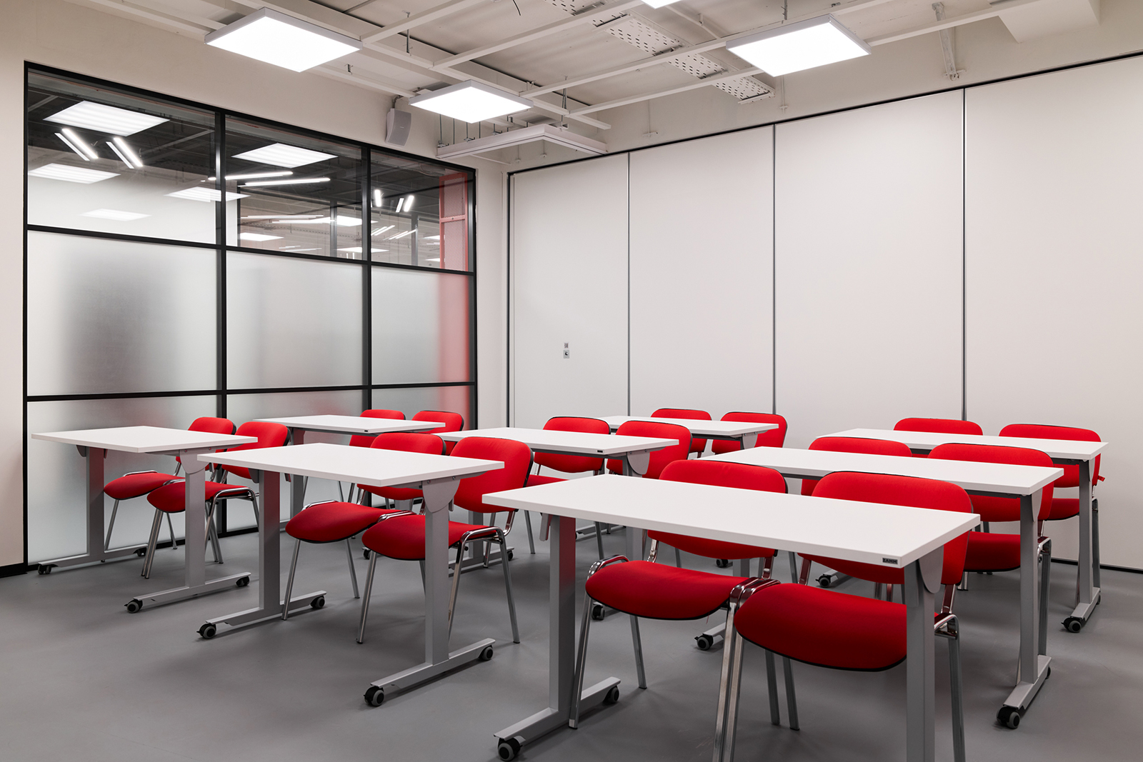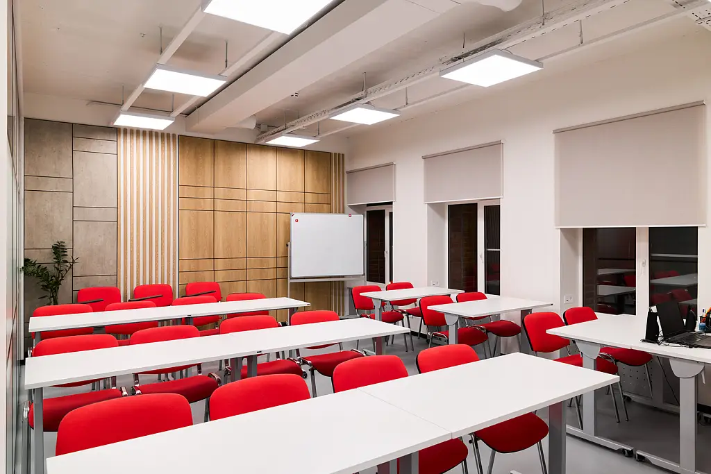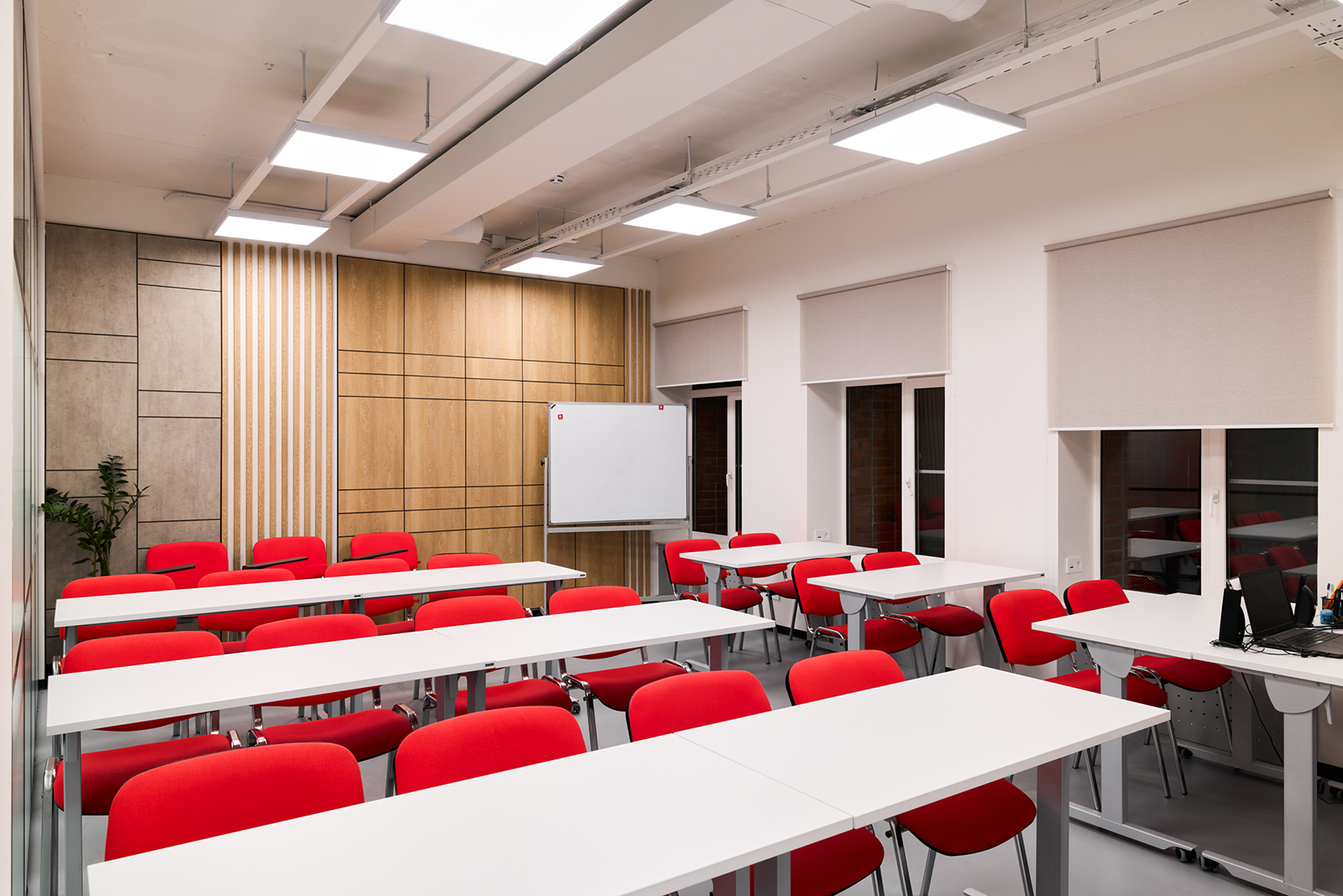 Учебные лектории: оснащены прямыми столами «Формат» и складными столами «Пилот Компакт» с практичными столешницами EGGER. Для комфорта и концентрации мы использовали настольные фетровые экраны, которые обеспечивают разграничение рабочих мест и эффективное зонирование.