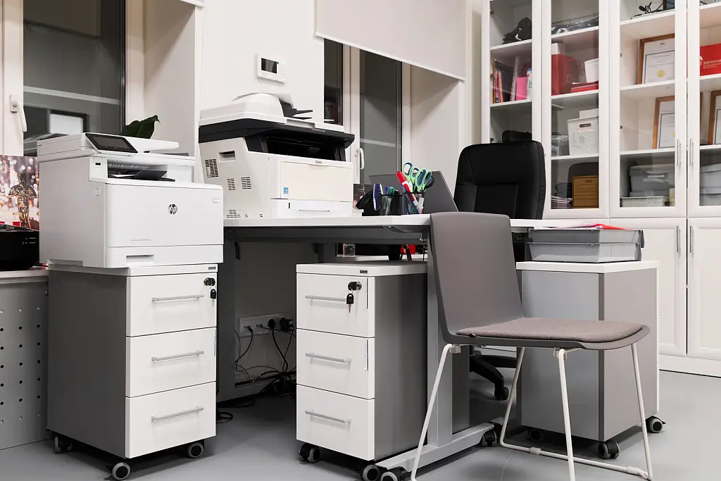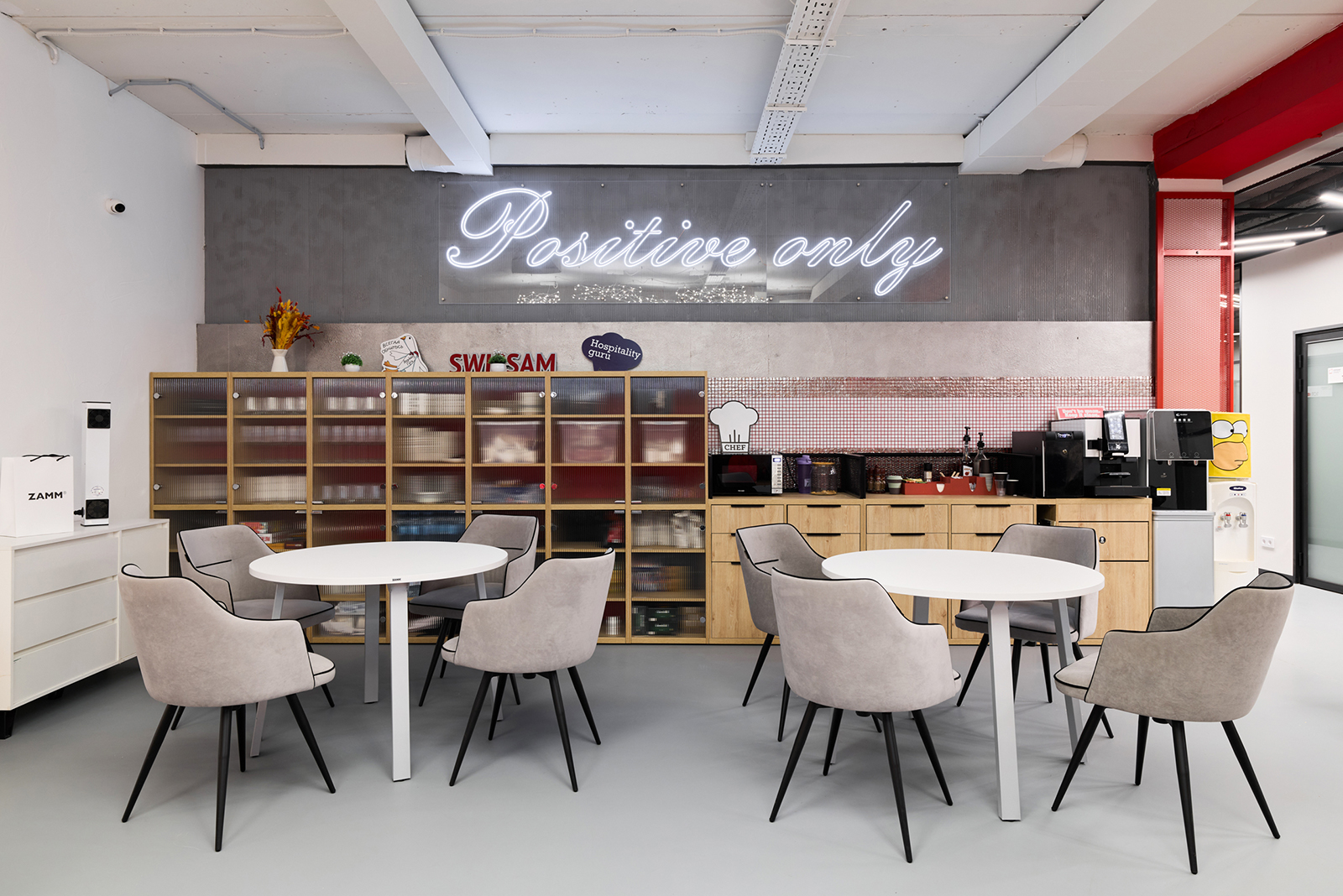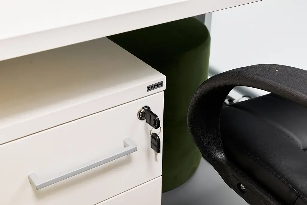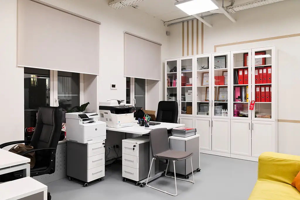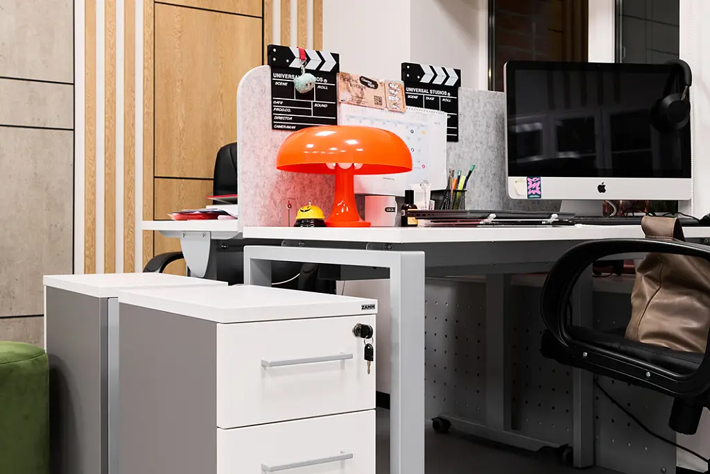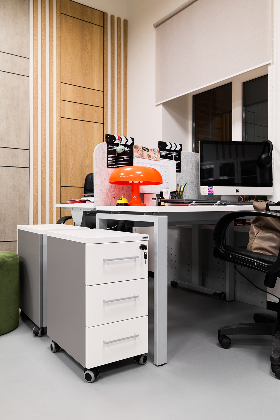 Рабочие кабинеты: для сотрудников мы организовали эргономичные рабочие места с мобильными тумбами, а также создали систему хранения надежными локерами и шкафами на металлокаркасе ZAMM.