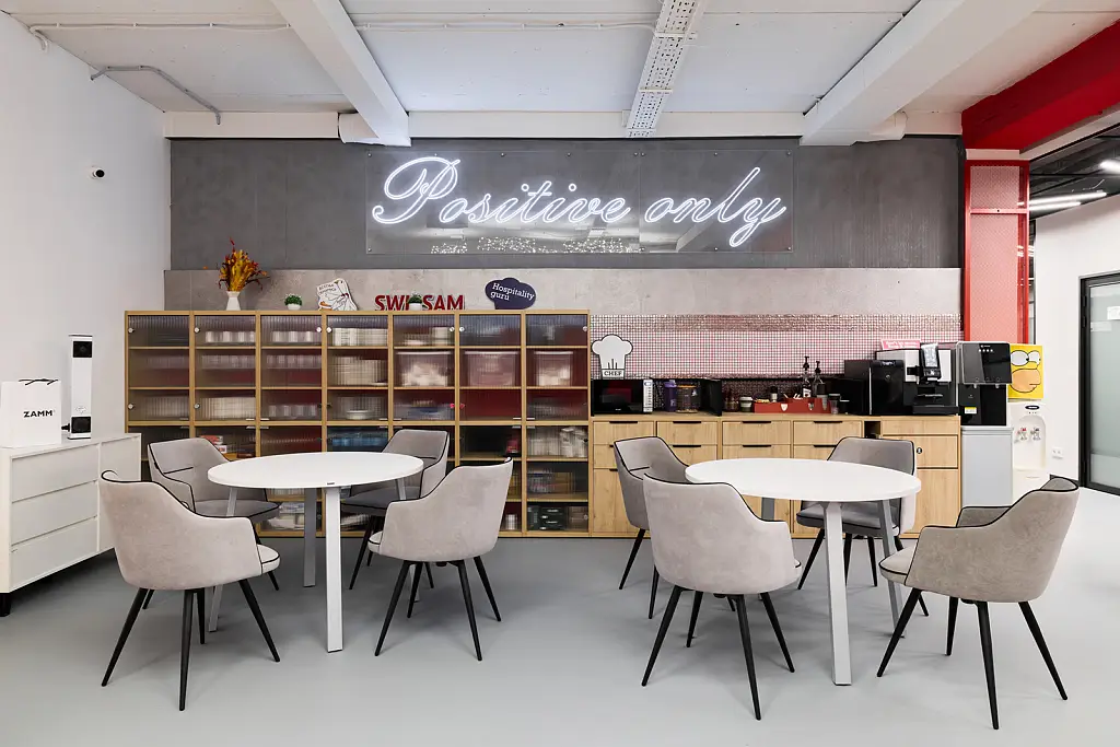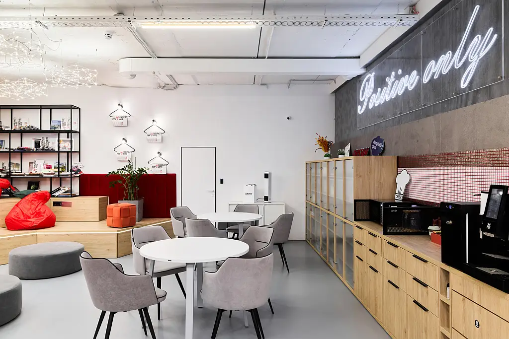 Зона отдыха: преобразили общую зону, установив круглые столы на независимых опорах. Столы обеспечили единый визуальный стиль пространства и создали удобное, приятное место для неформальных встреч и отдыха между занятиями.