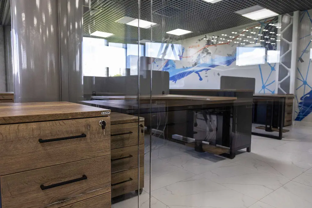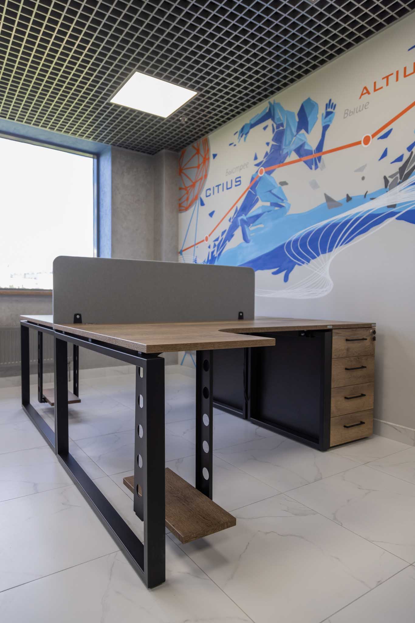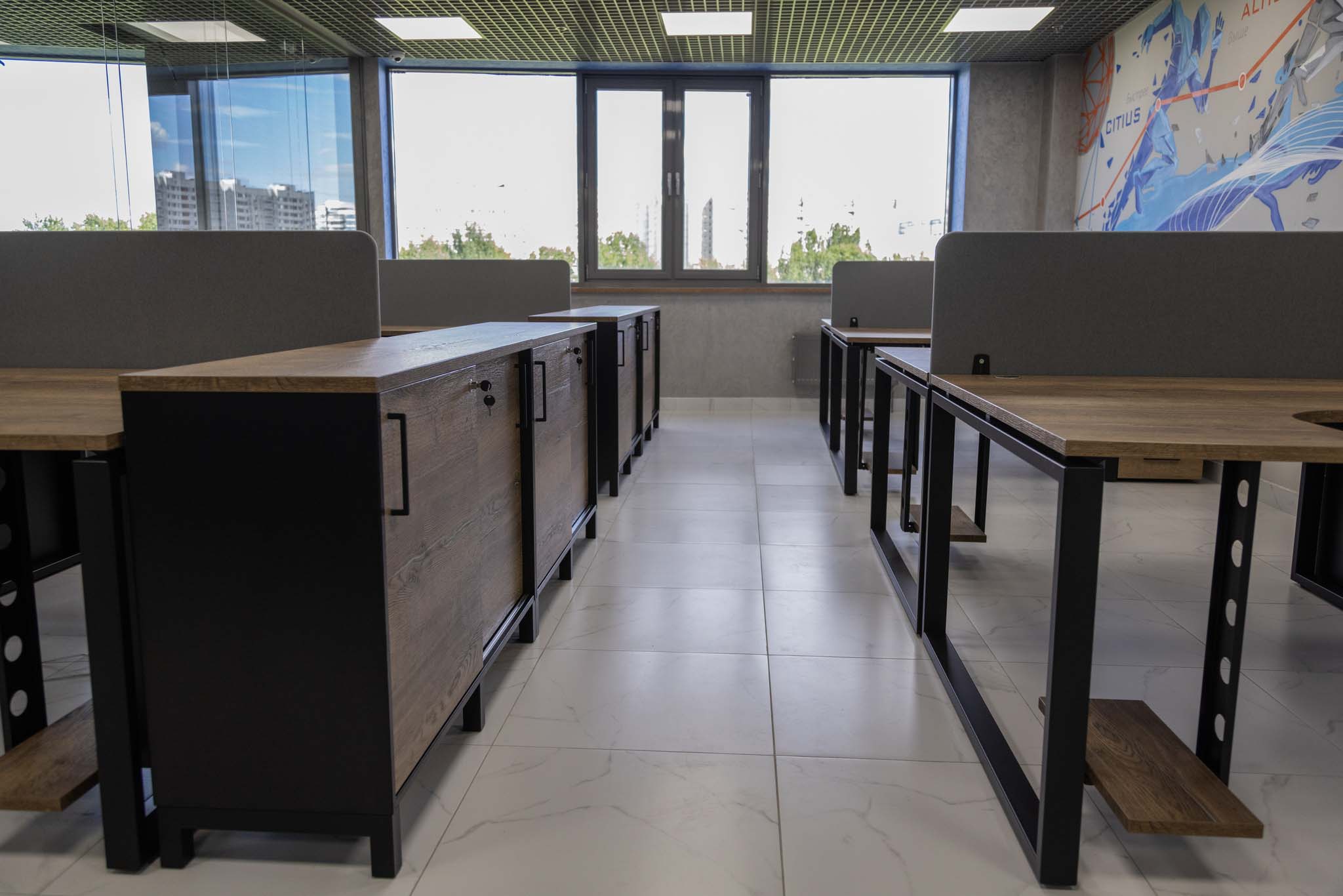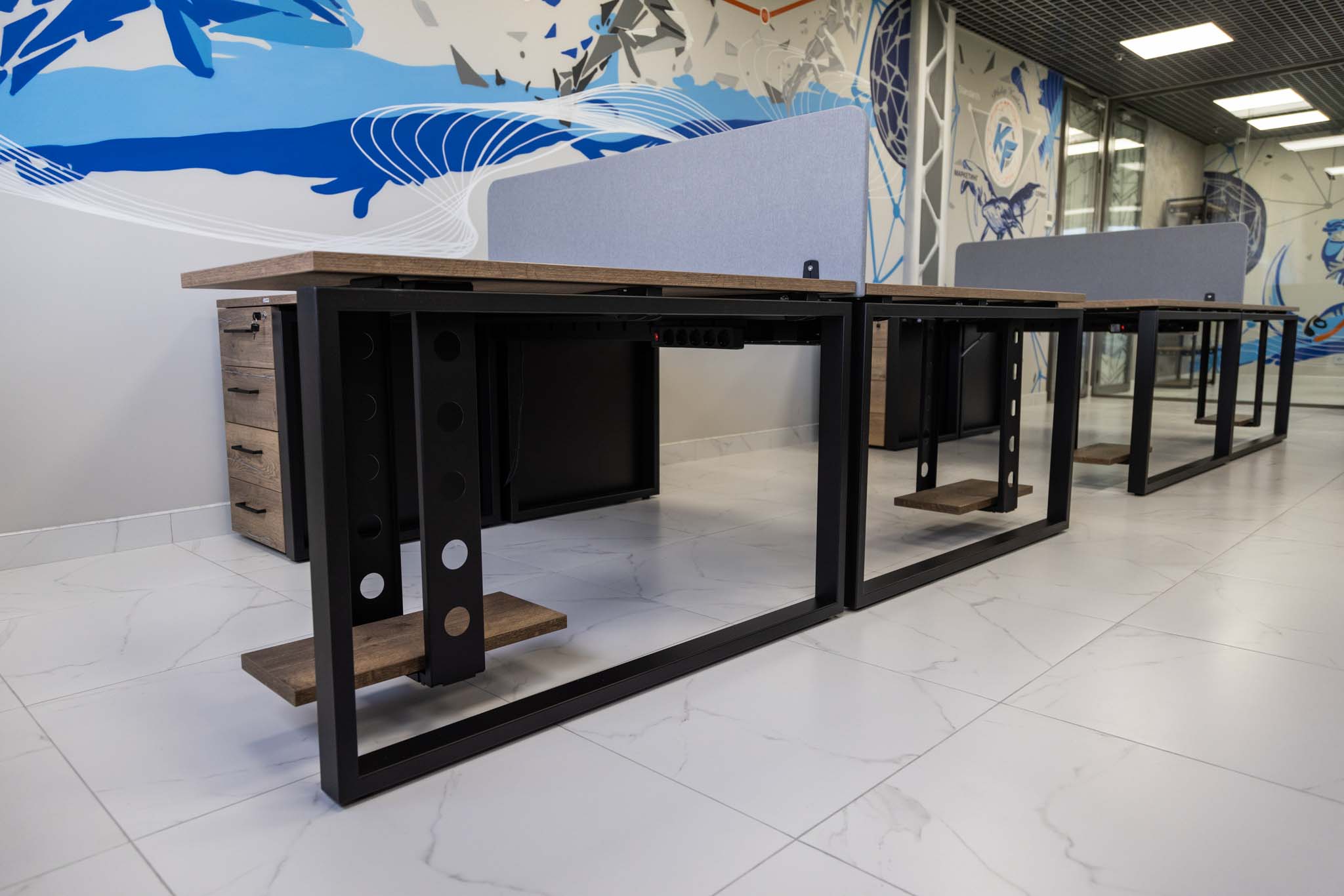 В проекте были использованы эргономичные столы Зета ТР с подвесами для системных блоков, бенч-системы с тканевыми перегородками, локеры, тумбы, высокие стеллажи и гардеробы.