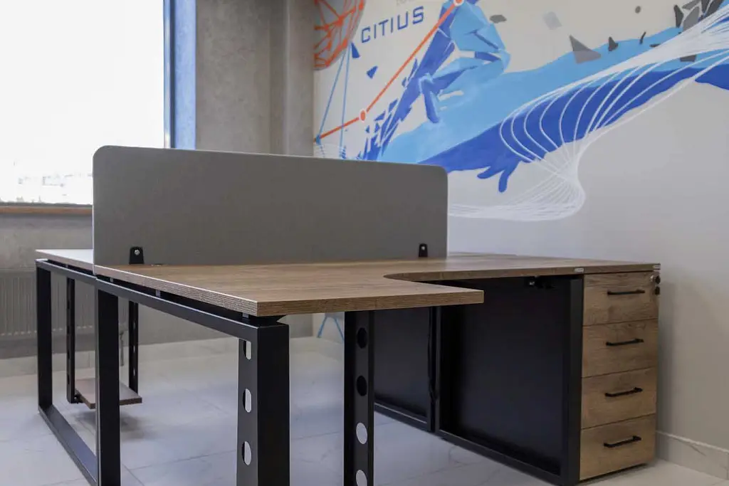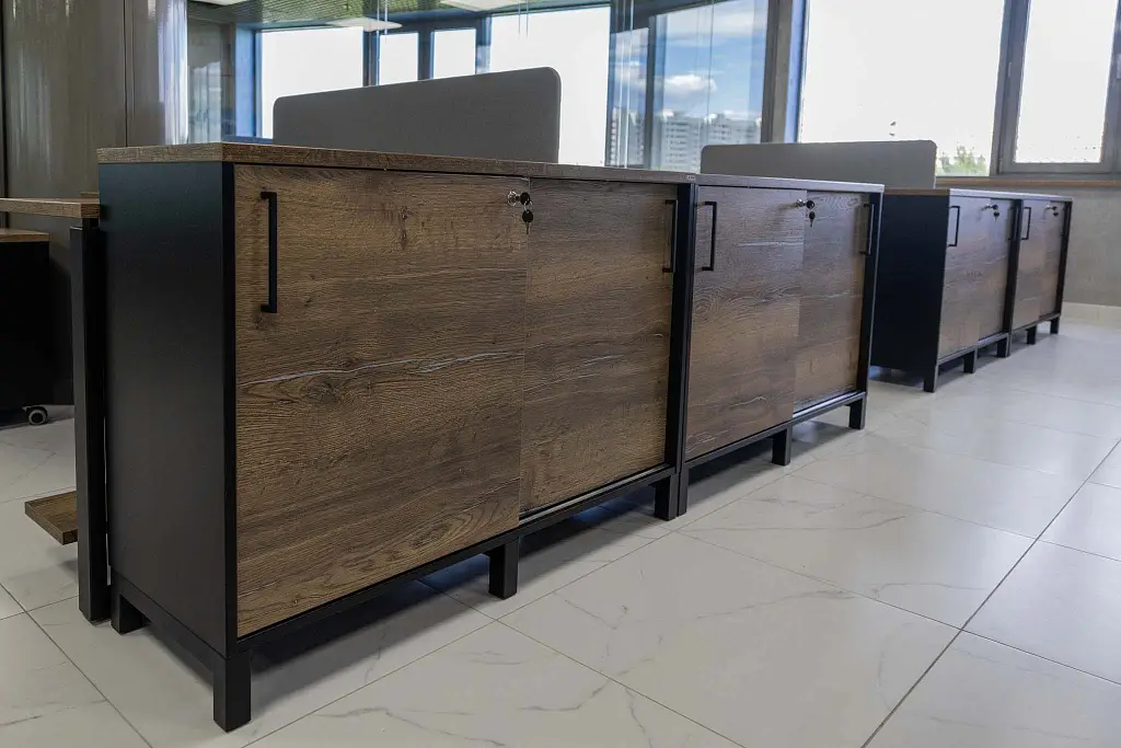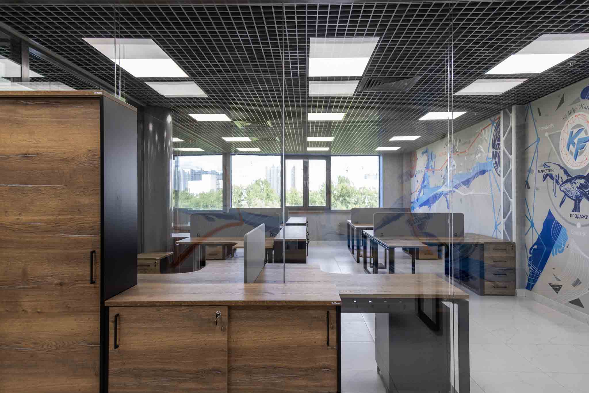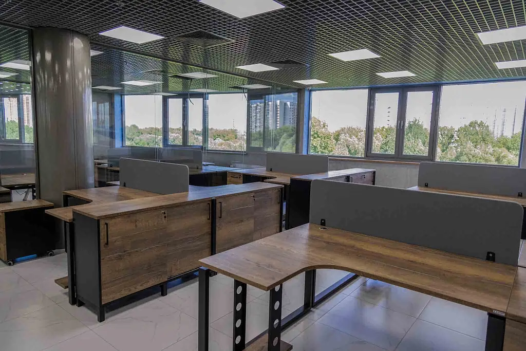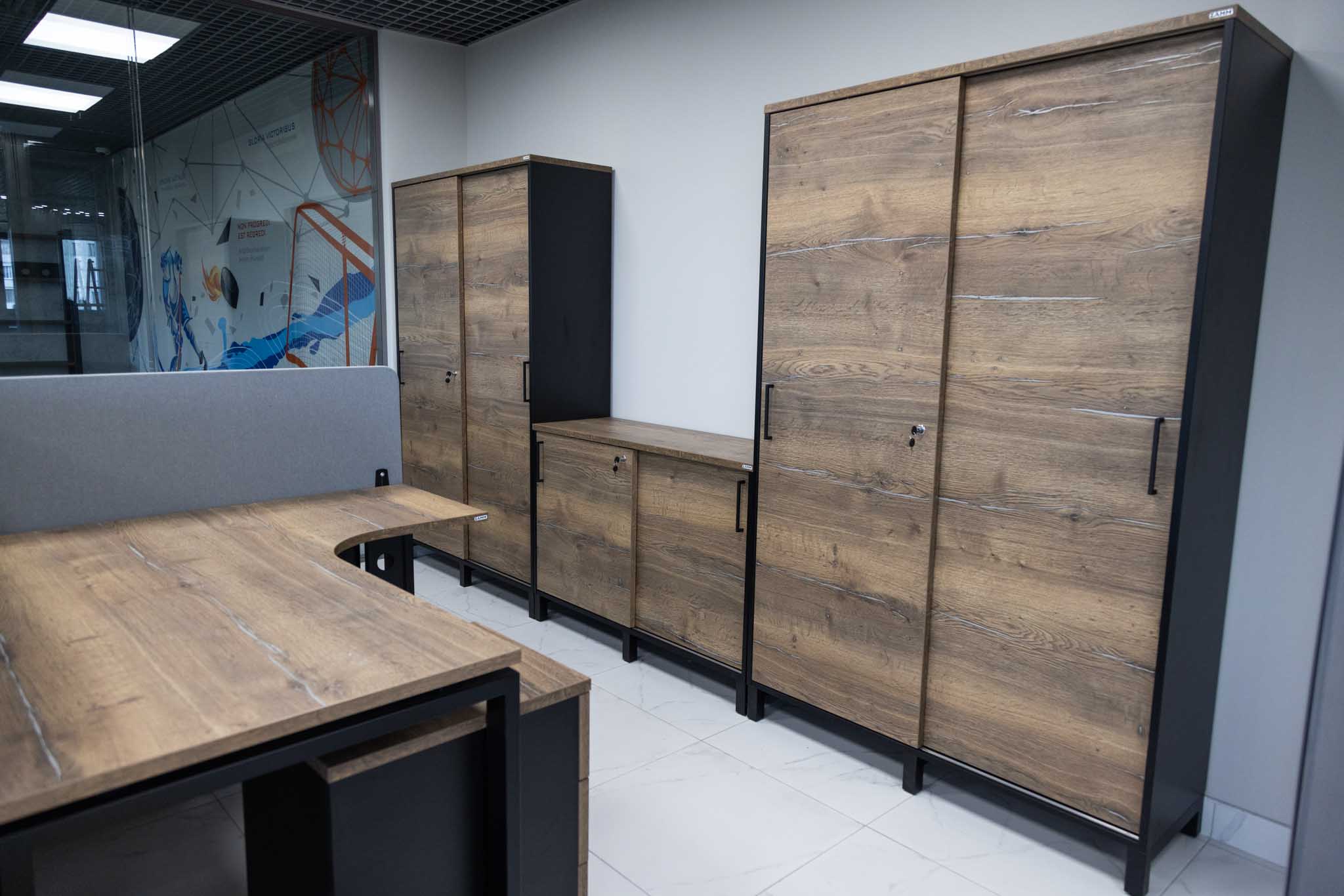 В проекте были использованы эргономичные столы Зета ТР с подвесами для системных блоков, бенч-системы с тканевыми перегородками, локеры, тумбы, высокие стеллажи и гардеробы.