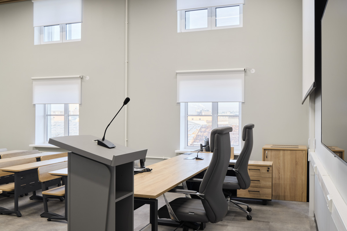 Каждая аудитория спроектирована так, чтобы можно было легко менять расстановку мебели в зависимости от типа занятий — лекций, семинаров, групповой или индивидуальной работы. Важным элементом проекта стало зонирование пространства: стеклянные перегородки разделяют помещения на зоны, уменьшают уровень шума и сохраняют естественное освещение.