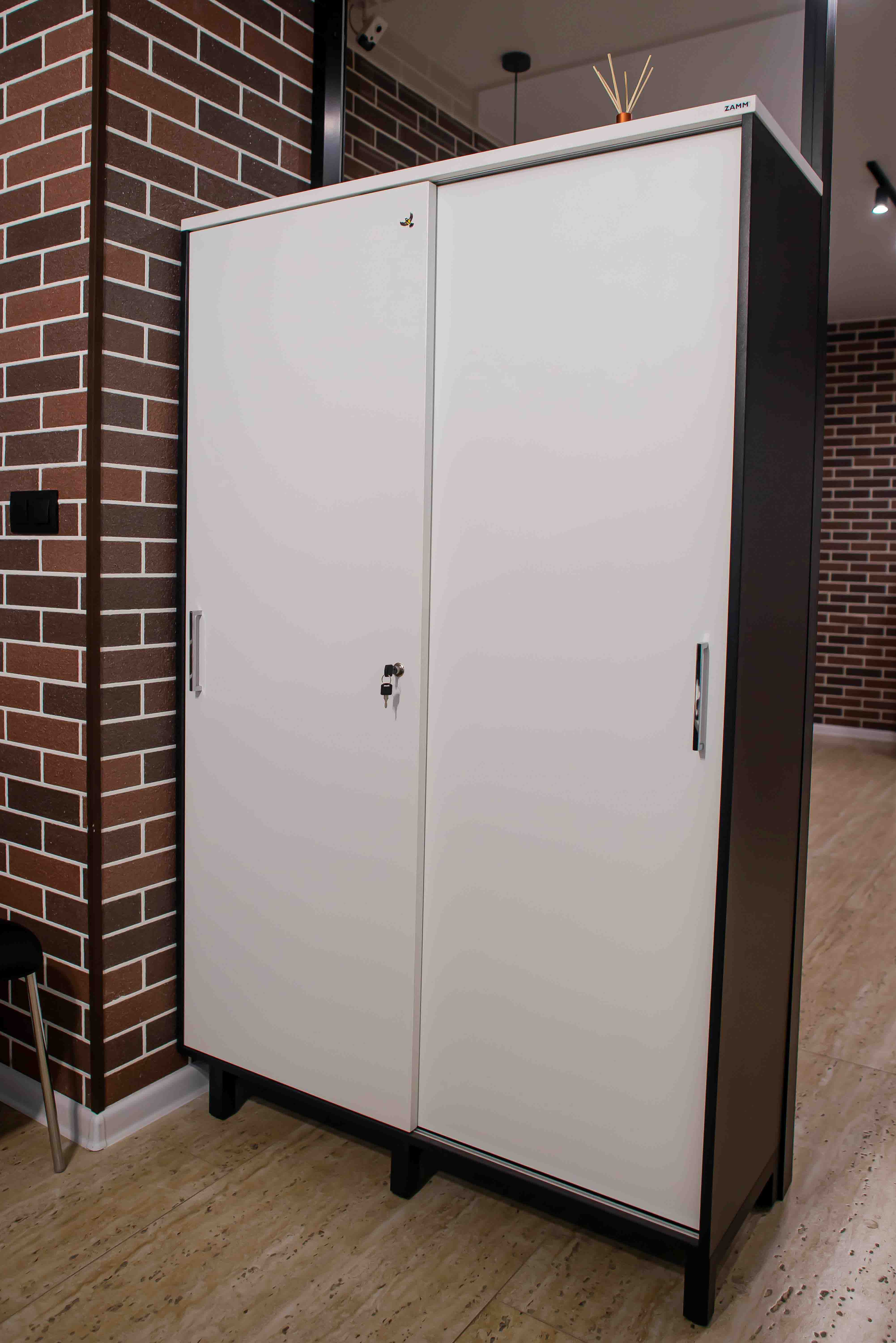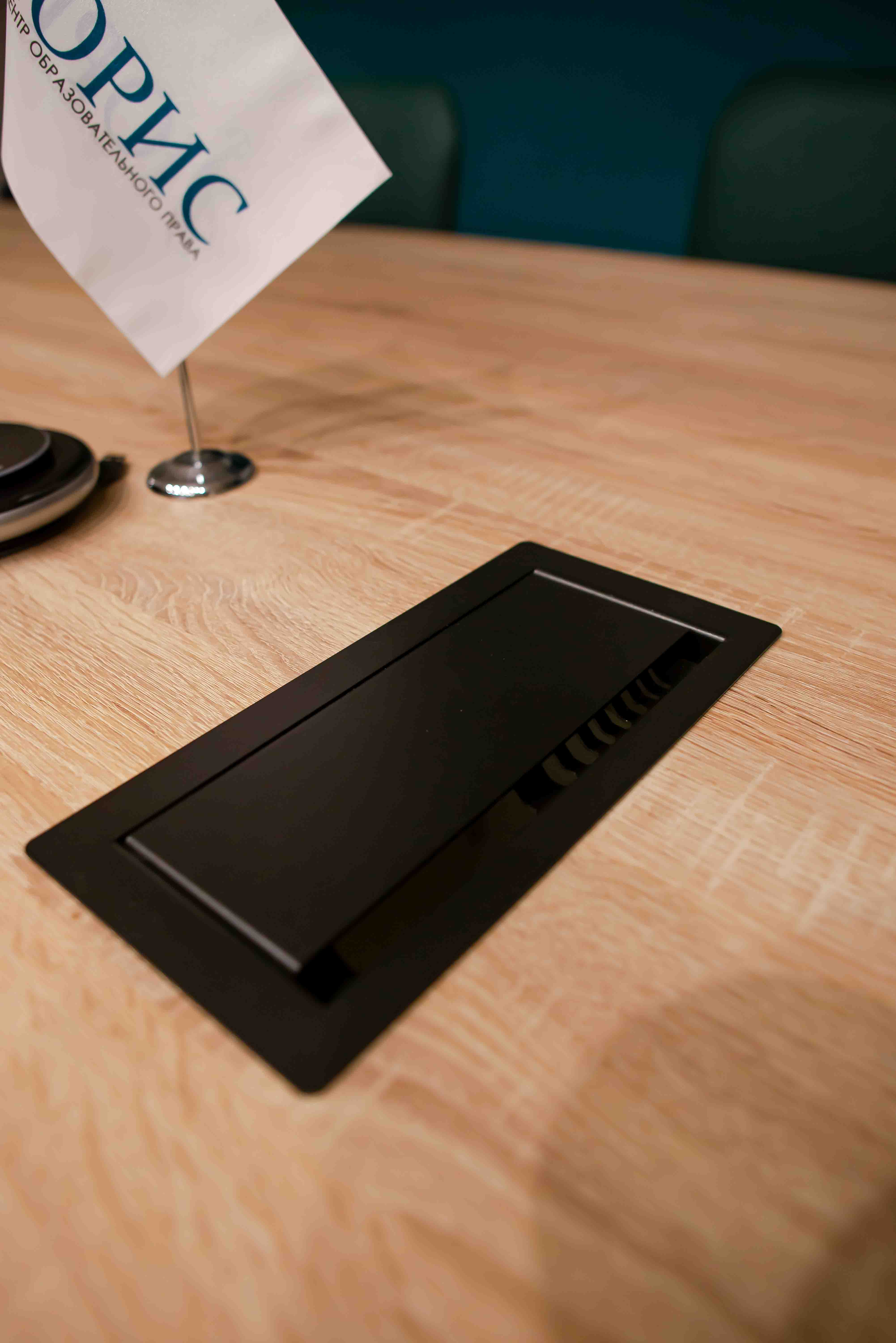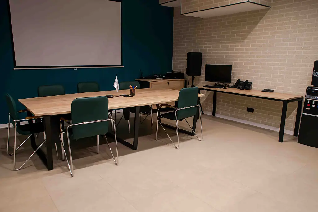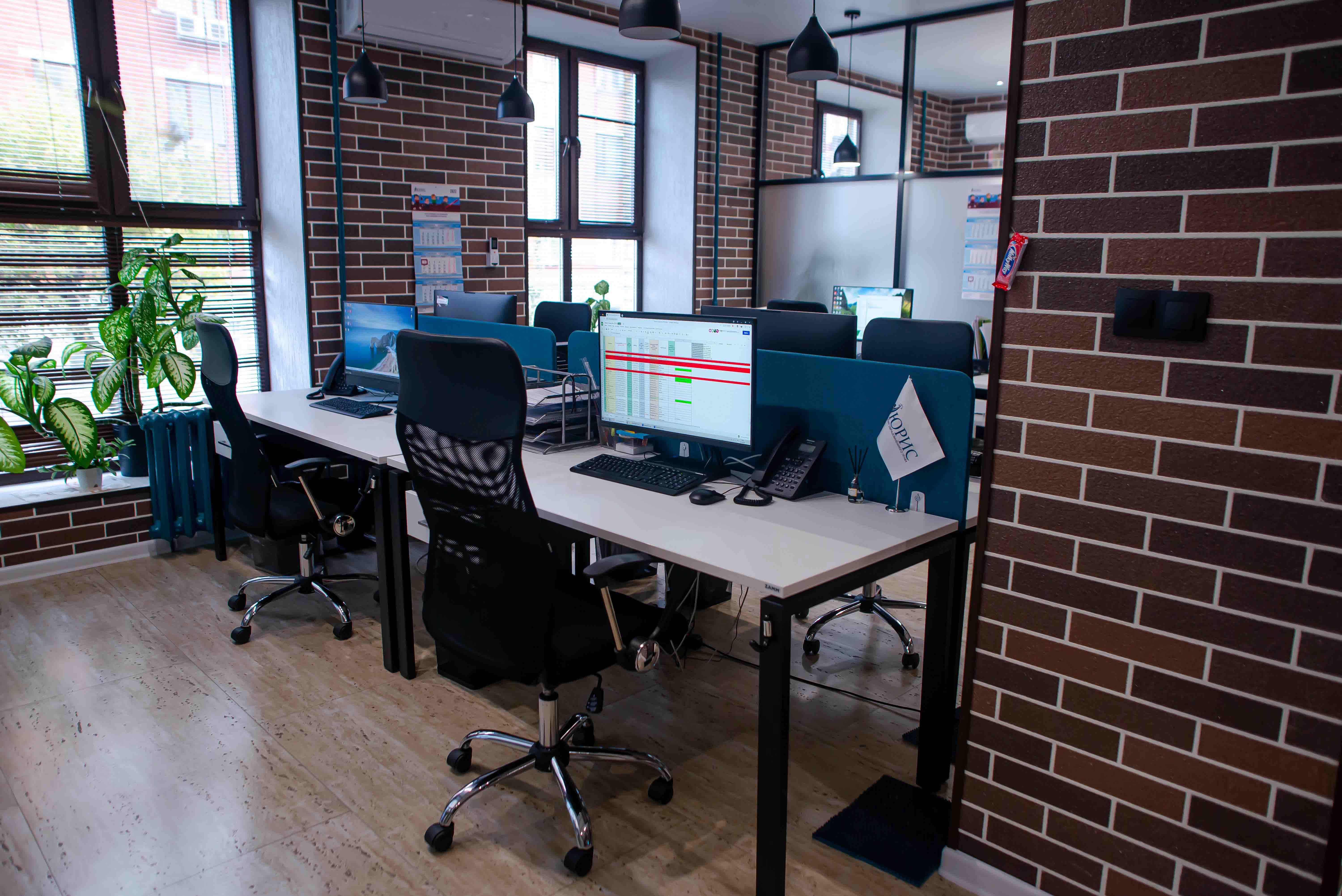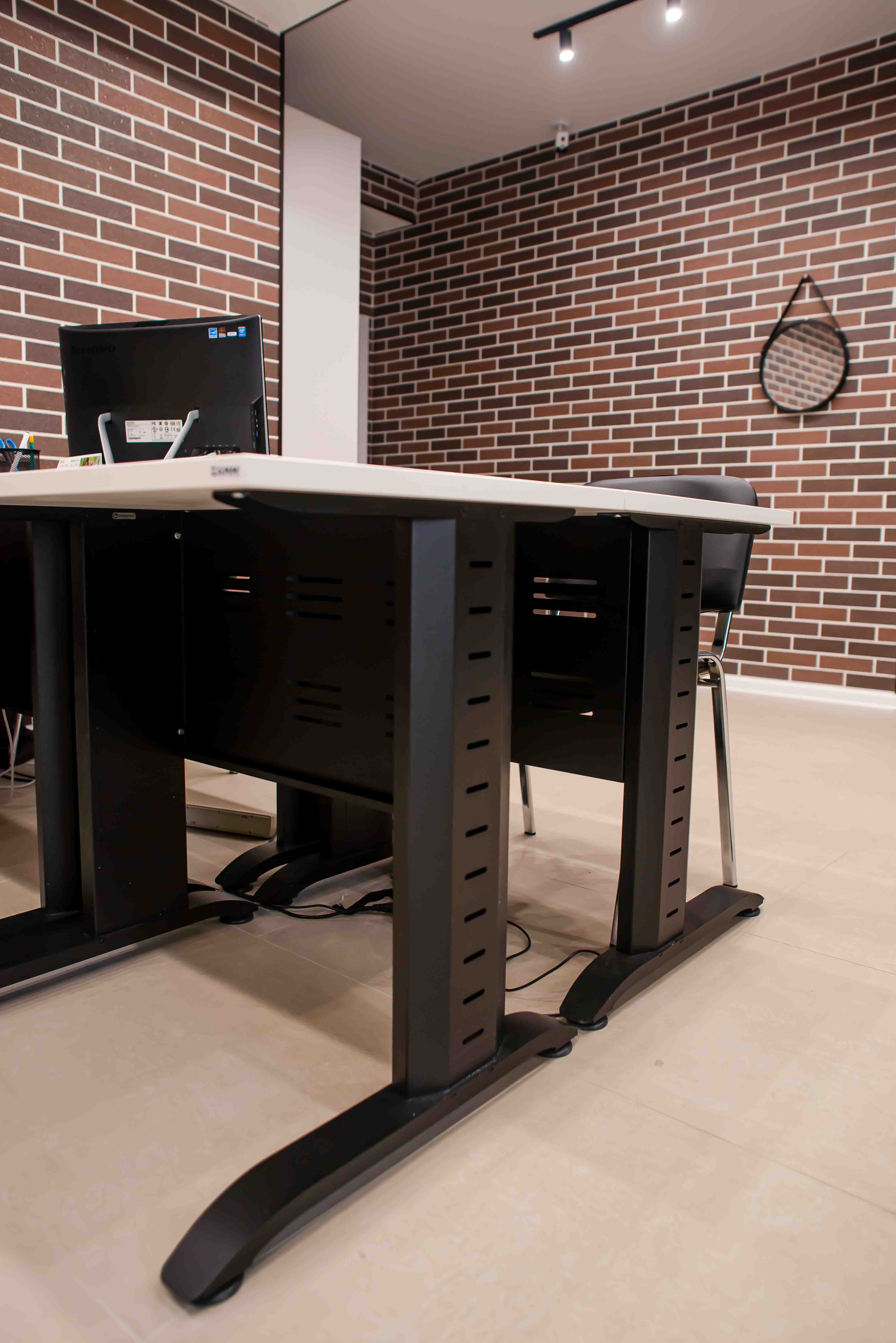 Офис выполнен в светлой гамме, поэтому мебель подобрана в классическом сочетании Дуба Чарльстон и черного металлокаркаса. Для другой части офиса приобретены столы, корпусная мебель и ресепшн в цвете Белый премиум, с черными опорами и корпусами, которые выигрышно выделяются на фоне оформленных под кирпич стен. В переговорной помещены два длинных стола: овальный Ирис для переговоров и Формат ТР, а также шкаф-купе цвета Дуб Бардолино.