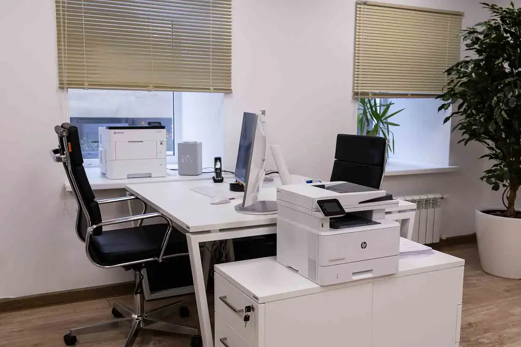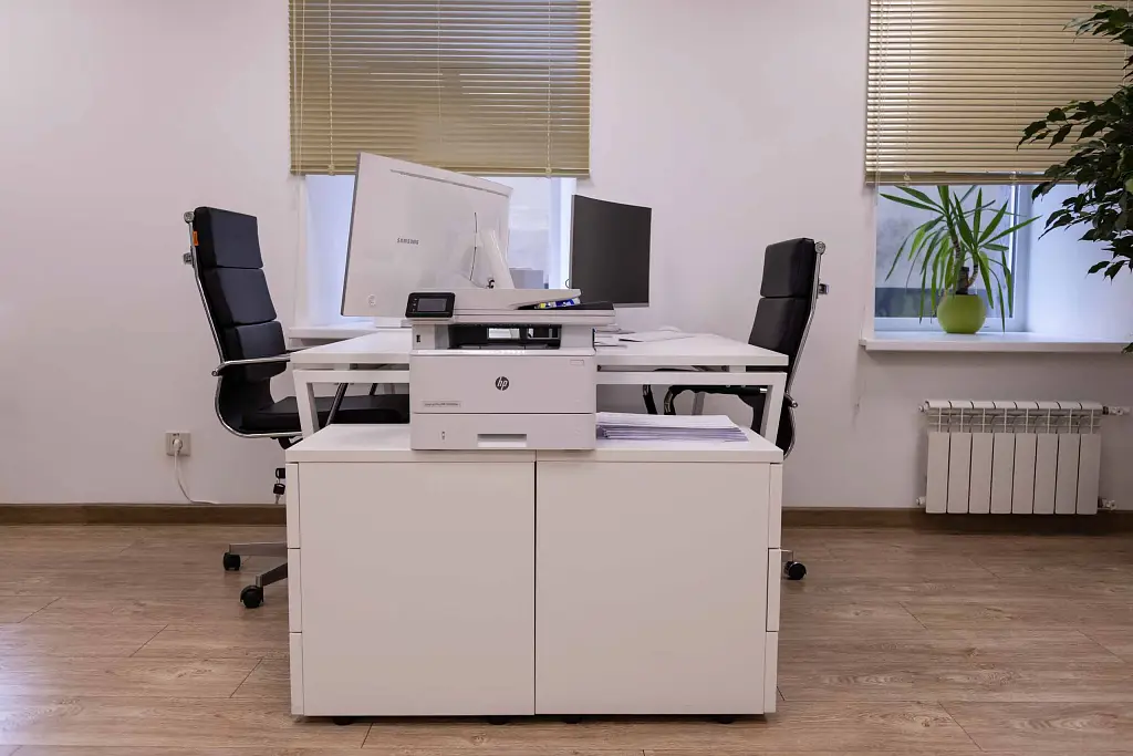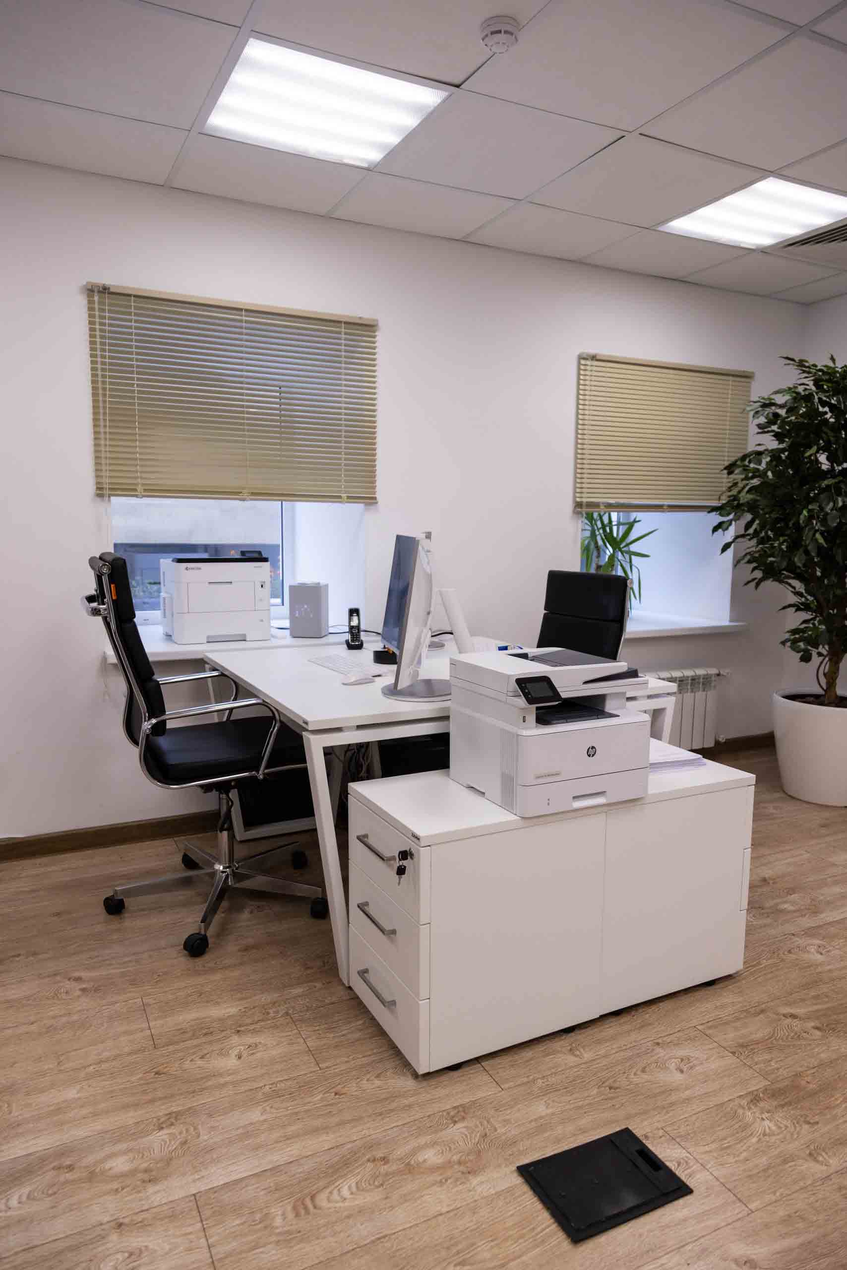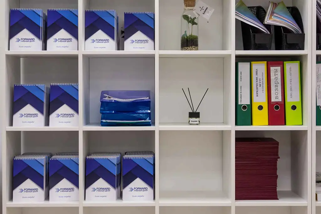 Cтеллаж MIX 5x4, столы Альфа 2 Классика, приставные тумбы на 3 ящика с центральным замком, столы Ирис ТР — мебель в офисе центра выполнена в цвете Белый Премиум/Белый матовый, в учебных классах — Дуб Бардолино/Аллюминиевый металлик.