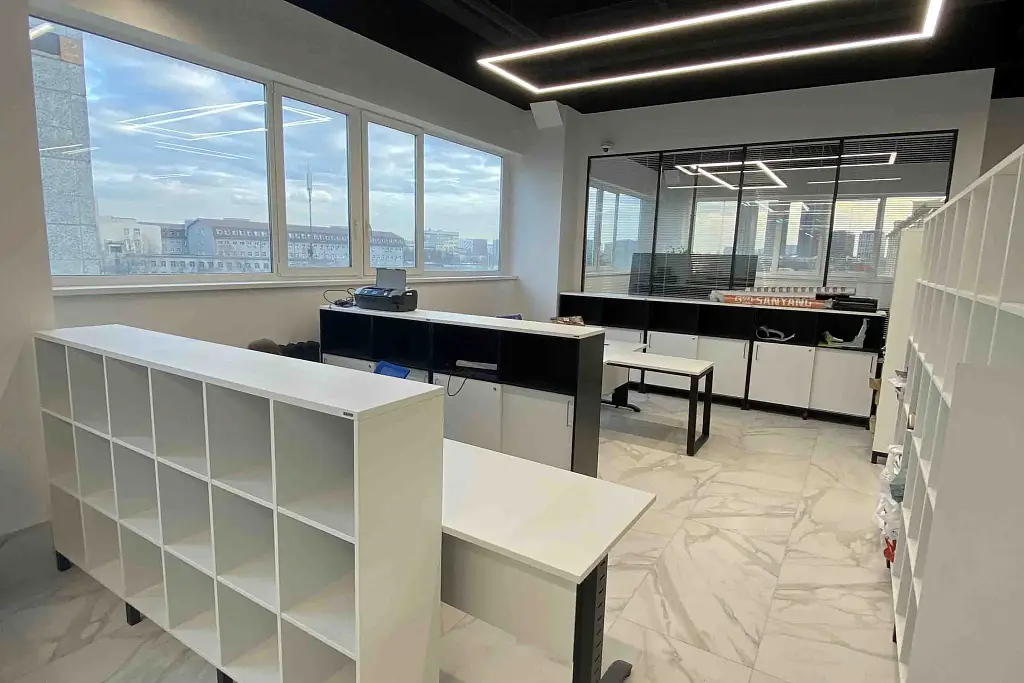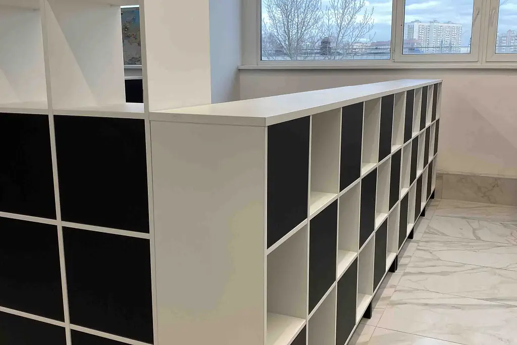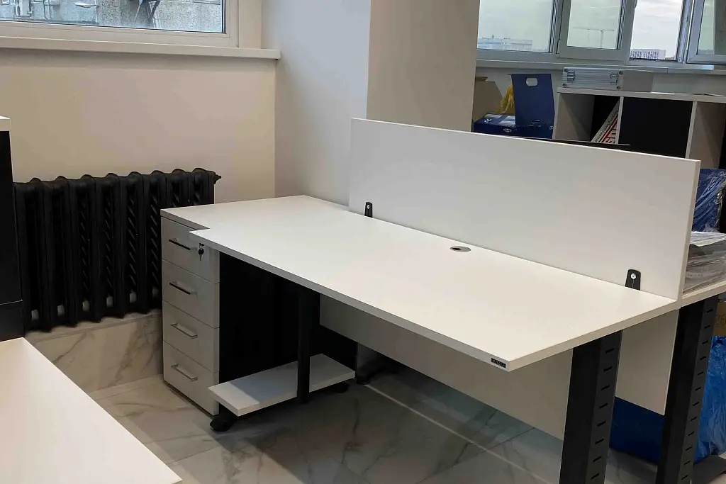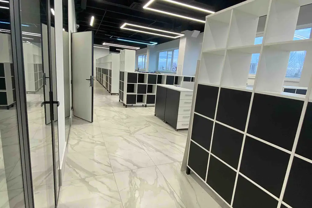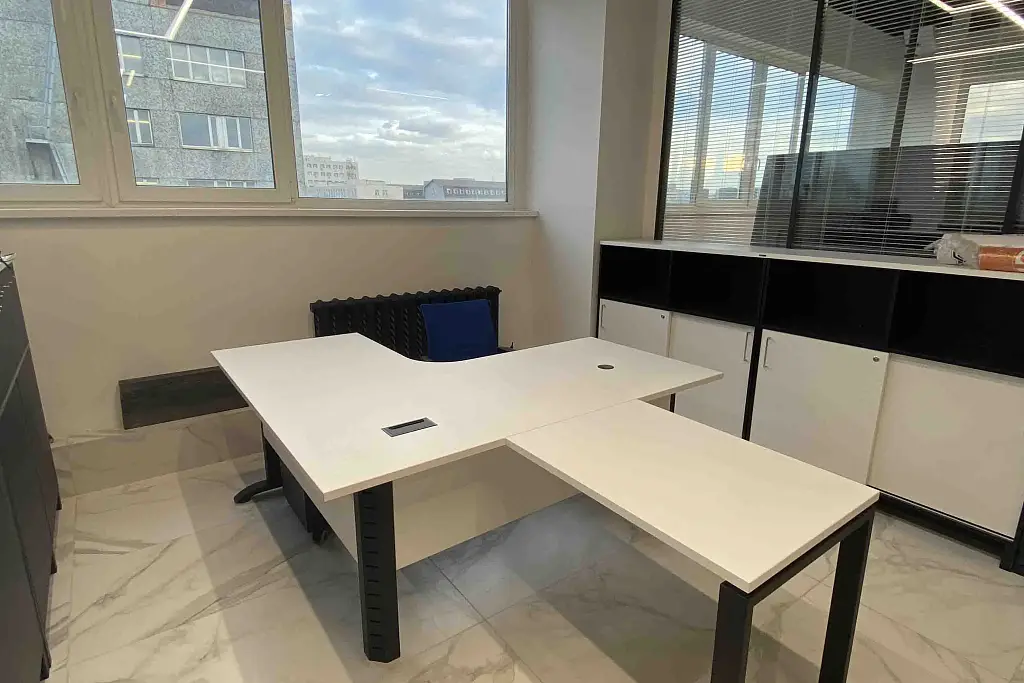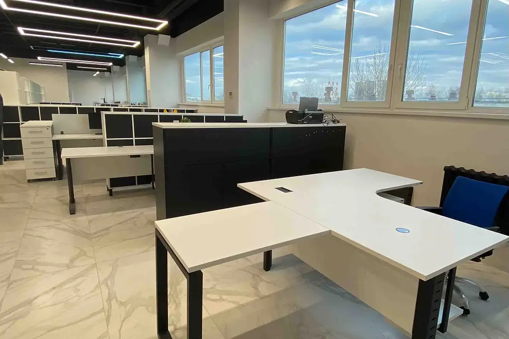 Минималистичный проект для офиса интернет-магазина вело и мототехники Велосити. В белом мраморном интерьере достойно выглядит корпусная мебель и столы в цвете Белый Премиум на черном металлокаркасе. Представлены модели Статус PRO с экраном ЛДСП, прямой стол для переговоров Зета и Пилот С. В кабинете руководителя размещен Гольф цвета ЛДСП Лес черный (на сайте не представлен, обращайтесь по телефону к нашим специалистам). В дополнение к столам идут локеры на две полки с надстройкой и стеллажные системы MIX.