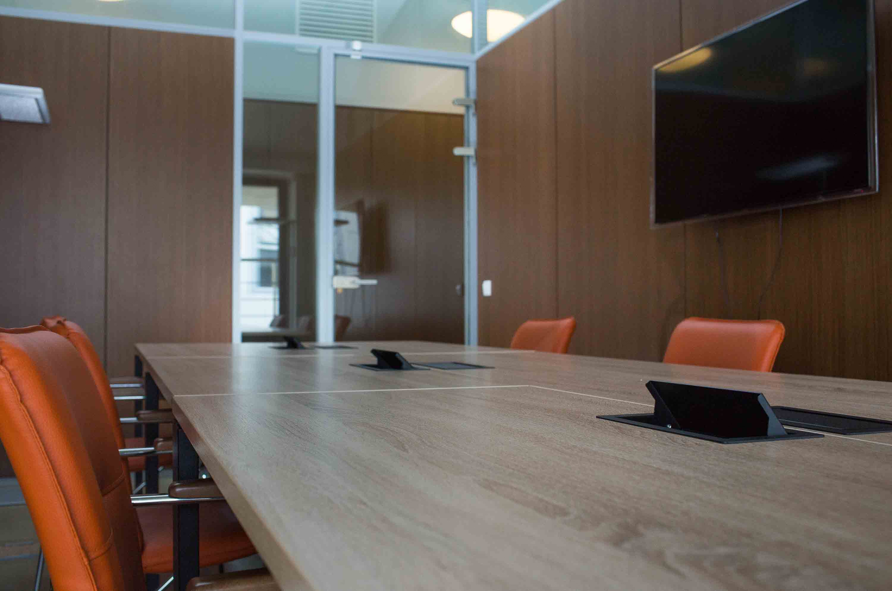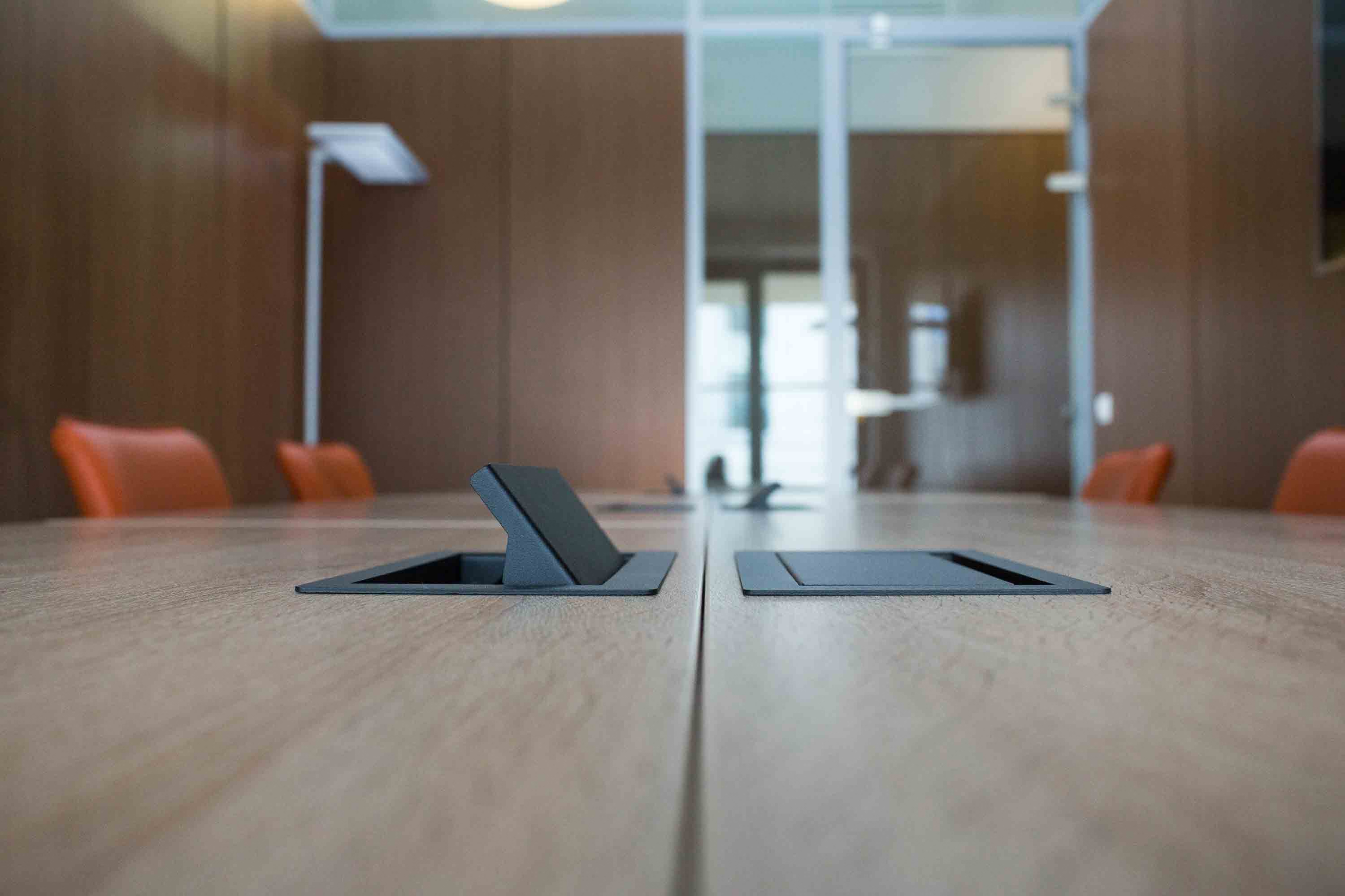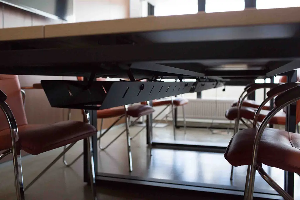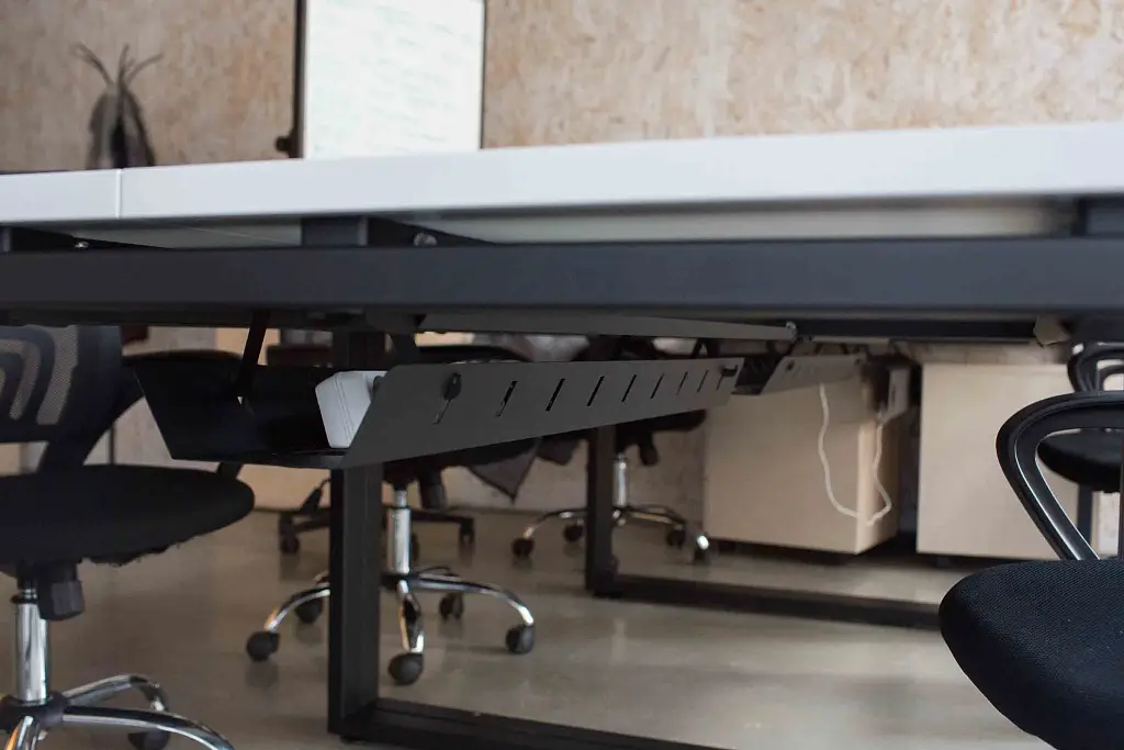 Каждое рабочее место оборудовано лючком для проводов ZAMM. Обратите внимание на то, как используются кабель-каналы. Это специальные лотки, куда убираются провода для удобного обустройства рабочих мест.